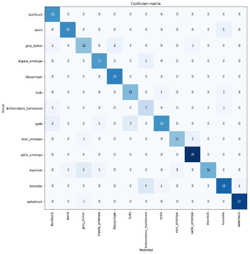 In this post we covered an end-to-end example of creating our own image dataset and using transfer learning to create an accurate deep learning image classifier for African antelope species. Our ResNet50 model reached an F1 score of 0.9 after only 24 epochs of training on roughly 880 examples spread over the 13 classes.