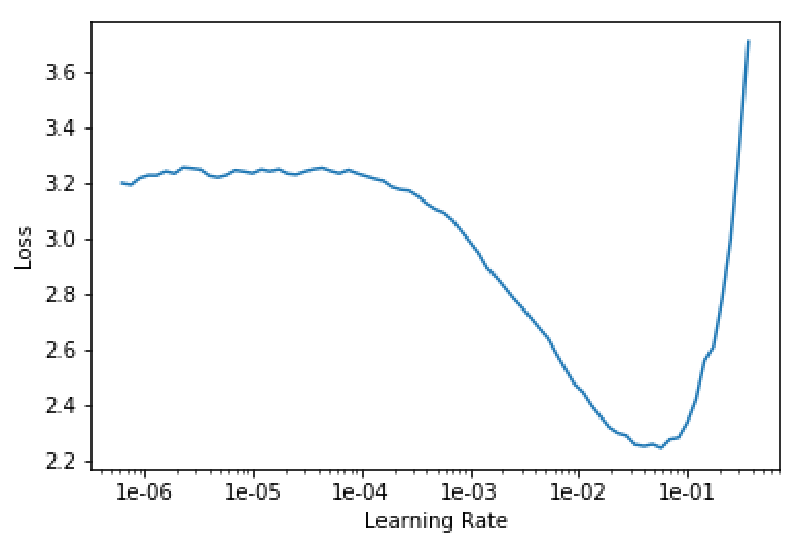 Before starting the training, we have to choose an appropriate learning rate, which is perhaps the single most important choice for effective training. FastAI provides the supremely useful lr_find method for this purpose, which is based on the technique discussed in Cyclical Learning Rates for Training Neural Networks.