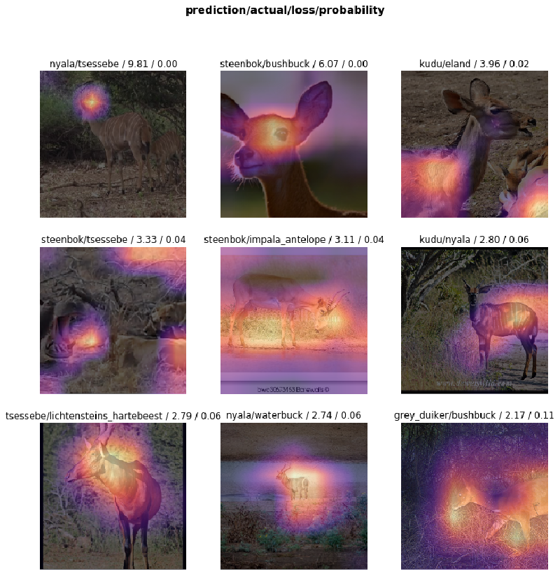 interp.plot_top_losses(9, figsize=(12,12), heatmap=True)Here we pass the parameter heatmap=True to the plot_top_losses method, which will produce Grad-CAM (Gradient-weighted Class Activation Mapping) heatmaps for the images. Grad-CAM visualisations highlight the important regions in the image used for the prediction.