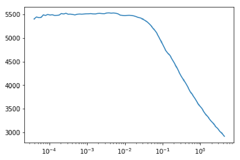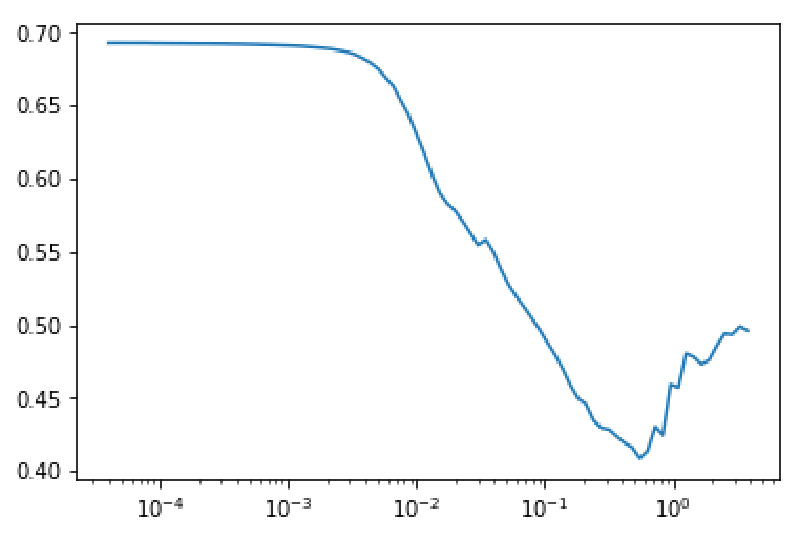 learn.recorder.plot()Doing the above will (after some training), produce a graph such as this: